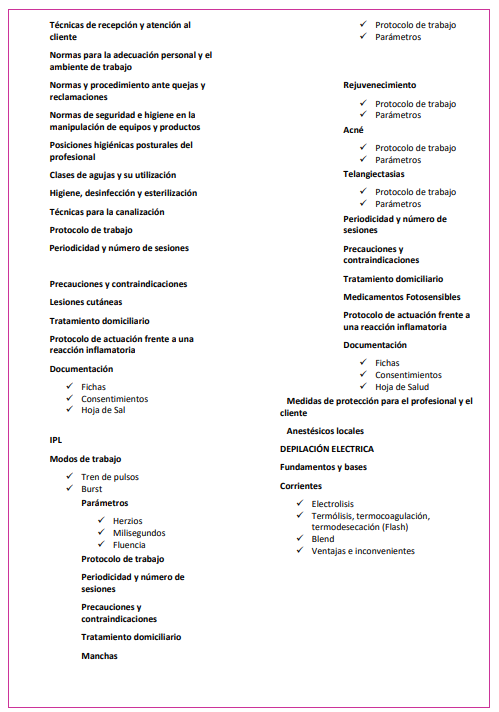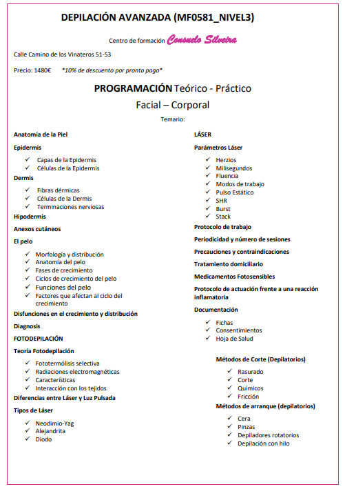 Un módulo que cumple con la entrada en vigor de la normativa europea 2017/745 de mayo 2020 para el uso de los equipos de depilación avanzada. Totalmente presencial y práctico, que cuenta con todos los equipos representativos de IPL y laser. Este curso consta de 140 horas teórico-practicas, y al finalizar el módulo obtendras una certificación de profesionalidad que lo otorga la Comunidad de Madrid, el SEPE y Europass, exigible a los profesionales según la normativa de trabajo aplicable.<br> <p><b>Curso de comienzo rotativo. Pregunta por la próxima fecha de Inicio</b></p>