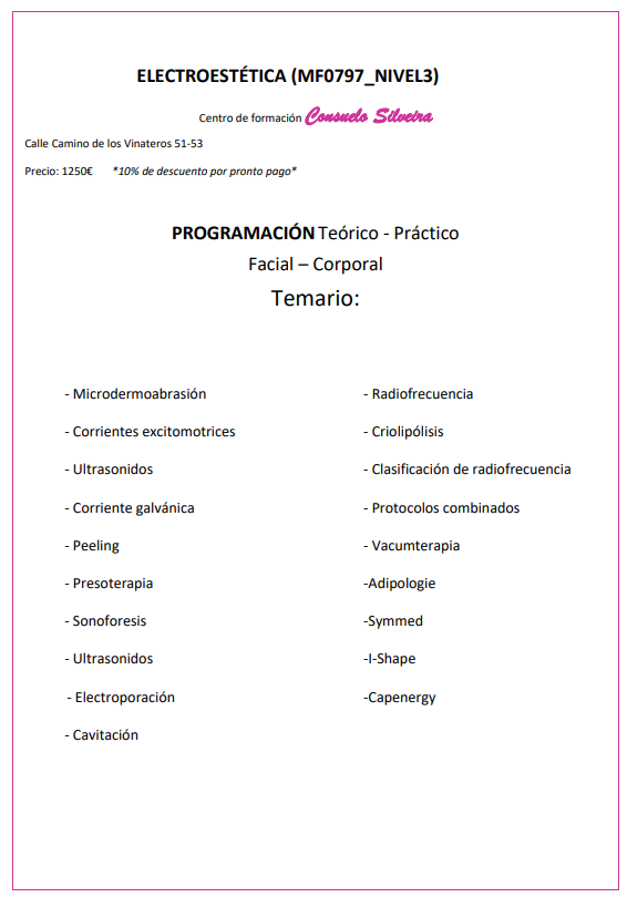 En nuestro módulo de electroestética MF0797_3, presencial y práctico podrás conocer en profundidad cada uno de estos últimos avances tecnológicos. Consta de 90 horas lectivas que realizamos en diferentes días y horarios para facilitar a los profesionales la realización de este módulo imprescindible