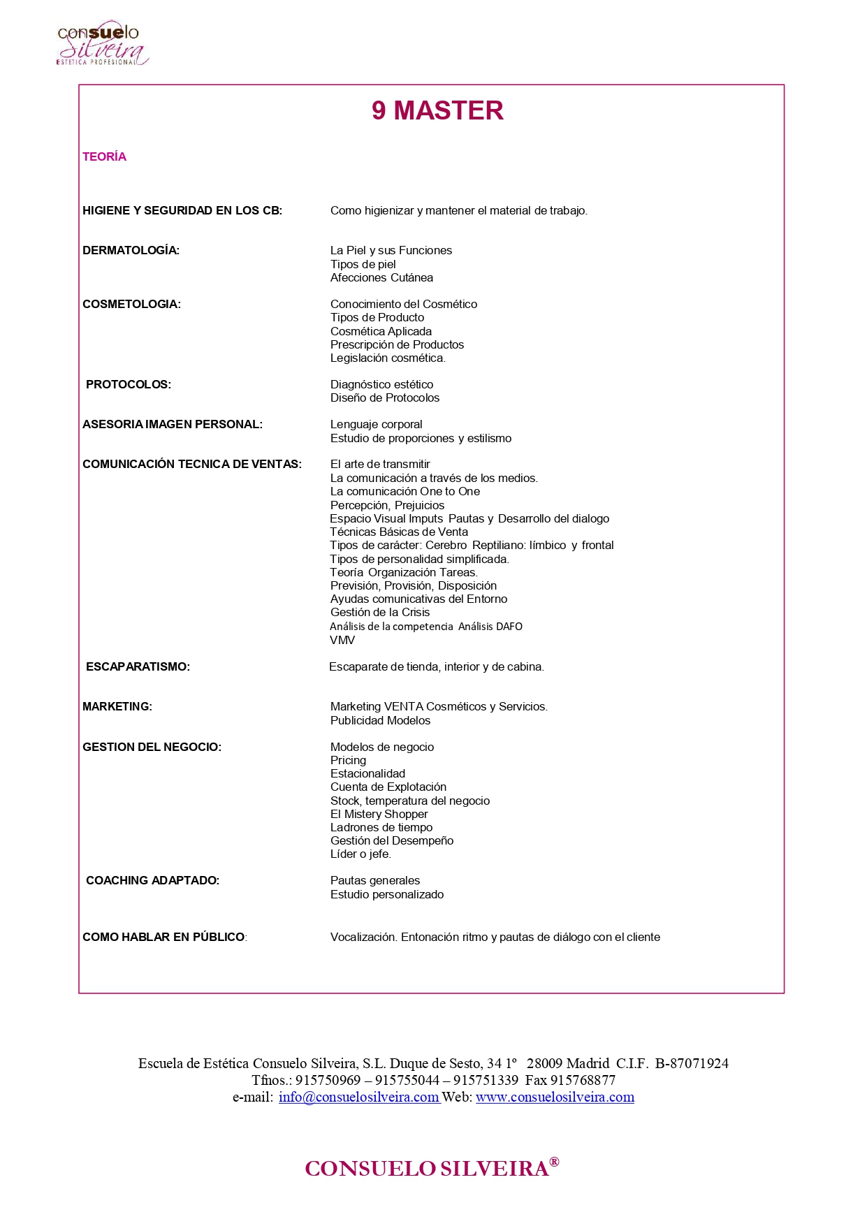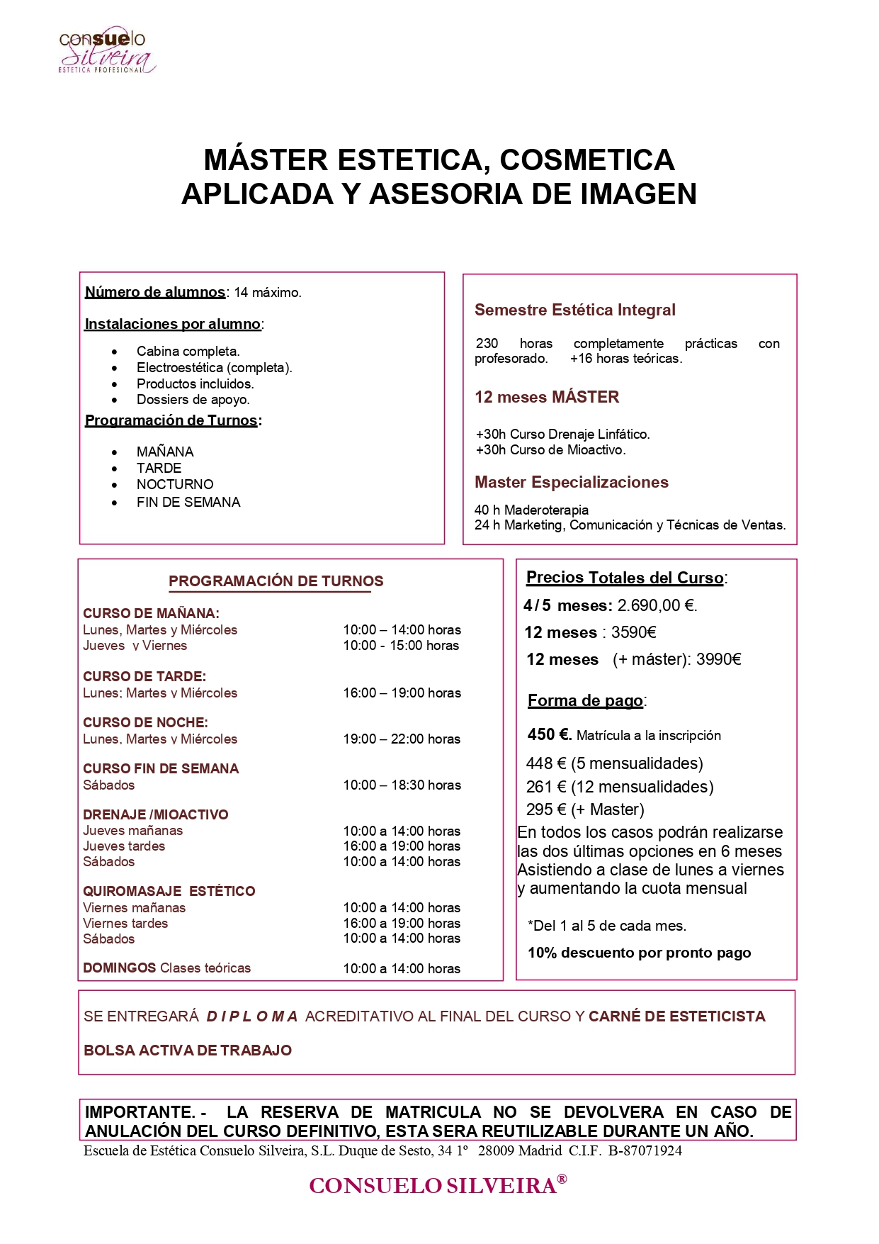 En este curso podrás obtener todos los conocimiento necesarios para poder ejercer, emprender o actualizarte en el mundo de la estética con el sello propio de Consuelo Silveira. Este curso incluye: Estética Integral y Estética avanzada, completarlo con los 10 temas monográficos de Marketing, comunicación y gestión del negocio. Curso de comienzo rotativo. Pregunta por la próxima fecha de Inicio