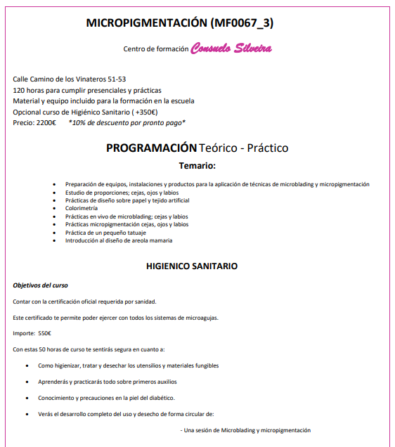 Este módulo con certificación de profesionalidad es totalmente presencial y práctico el cual, incluye: microblading y micropigmantación en cejas, ojos y labios, así como, el permiso de higiénico sanitario exigido. Con un máximo de 10 alumnos la profesora prestará una atención exhaustiva a cada uno de ellos, contando con suficientes equipos para prácticas y los pigmentos de la mejor calidad.